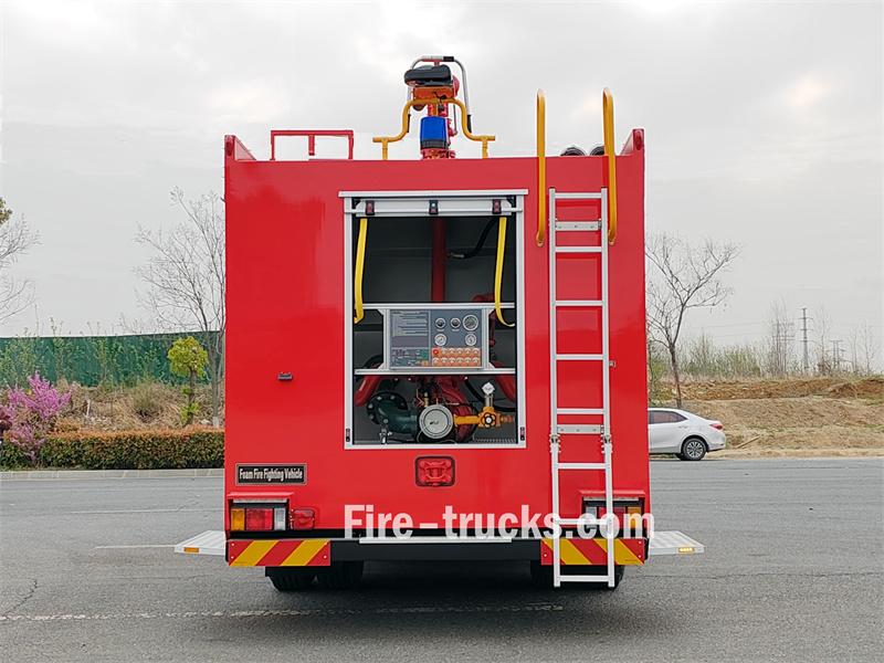 The Isuzu FVZ GIGA 6 cubic meter foam fire truck is based on the Isuzu FVZ GIGA chassis, with a 4500mm wheelbase. It is equipped with an Isuzu 6HK1-TCG60 engine and a Fast 9-speed transmission. The front of the superstructure houses the equipment compartment, the middle section contains a 5000L carbon steel water tank and a 1000L stainless steel foam tank, and the rear is the pump room, equipped with a CB10/40-XZ fire pump, control panel, fire hoses, firefighting equipment, etc. A PL8/32 fire monitor is located on the roof.