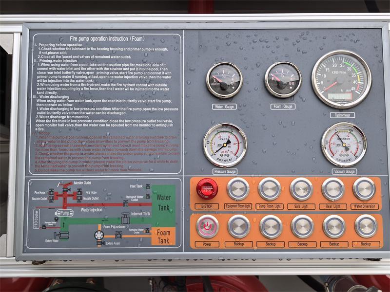 Control panel: Integrates tachometer, vacuum gauge, pressure gauge, foam level gauge, water level gauge, operating instructions, pipeline diagram, PTO indicator light, equipment box light, vacuum pump switch, external light switch, main power switch, electronic throttle control, emergency stop switch and other buttons.
