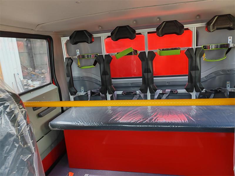 Equipment Storage: The front equipment room features a fully enclosed aluminum alloy roller shutter door design, allowing for the organized storage of various firefighting equipment, such as fire hoses, fire axes, shovels, picks, fire extinguishers, fire suits, and hose bridges, facilitating quick access for firefighters.