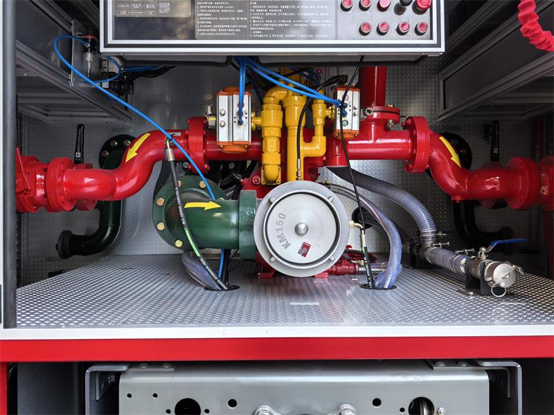 Tank System: The front part is the equipment room, where various firefighting equipment (such as fire hoses, fire extinguishers, fire axes, wrenches, hammers, picks, etc.) are stored for easy access. In the middle, there is a 9-cubic-meter carbon steel water tank and a 3-cubic-meter foam tank, both equipped with manholes on top.