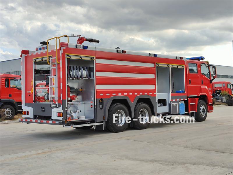 The Isuzu GIGA 6X4 10 cubic meter foam fire truck is based on the Isuzu GIGA 6X4 chassis, with a wheelbase of 4600mm+1370mm. It is equipped with an Isuzu 6UZ1-TCG61 engine and a Fast 12-speed transmission. The front of the superstructure houses the equipment compartment, the middle section contains an 8500L carbon steel water tank and a 1500L stainless steel foam tank, and the rear is the pump room, equipped with a CB10/60-XZ fire pump, control panel, fire hoses, firefighting equipment, etc. A PL8/48 fire monitor is located on the roof.