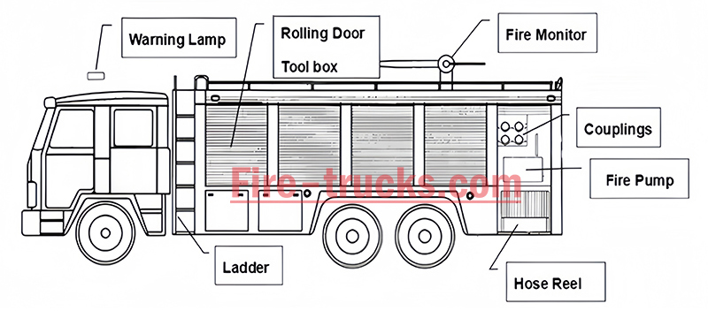 • Equipment Room: Located at the front of the vehicle's superstructure, this room is equipped with equipment racks and pull-out hanging shelves. The racks are logically designed to neatly store various firefighting equipment (fire suits, fire blankets, hose covers, fire bridges, fire extinguishers, etc.); the pull-out hanging shelves provide easy and quick access to commonly used equipment such as fire axes, picks, shovels, wrenches, hammers, and crowbars, improving rescue efficiency.