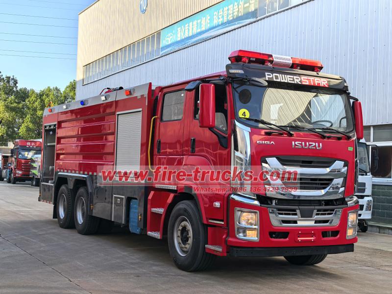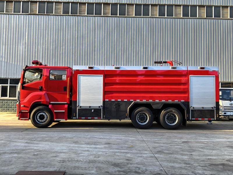 tanker material PP, 4X4, 6X6 drive, RHD driveCB10/140 Fire pump Togo 12,000L Foam Fire Truck on Giga Isuzu, also called as Giga Isuzu foam fire tender or Isuzu giga foam fire vehicles, utilizes the ISUZU GIGA heavy duty chassis and is equipped with an Isuzu 6WG1 engine (520 hp/380 kW). It features 11.00R20 tires and a 4650+1300mm wheelbase, ensuring high maneuverability and load-carrying capacity. The cab features integrated warning lights, a loudspeaker, and red and blue strobe lights, while a 35W rear headlight is installed. The water tank has a capacity of 6000L, and the foam tank has a capacity of 6000L. Both are constructed of high-quality carbon steel or stainless steel, with the tanks positioned centrally. The equipment compartment features a semi-enclosed steel frame structure with fixed/movable internal partitions.